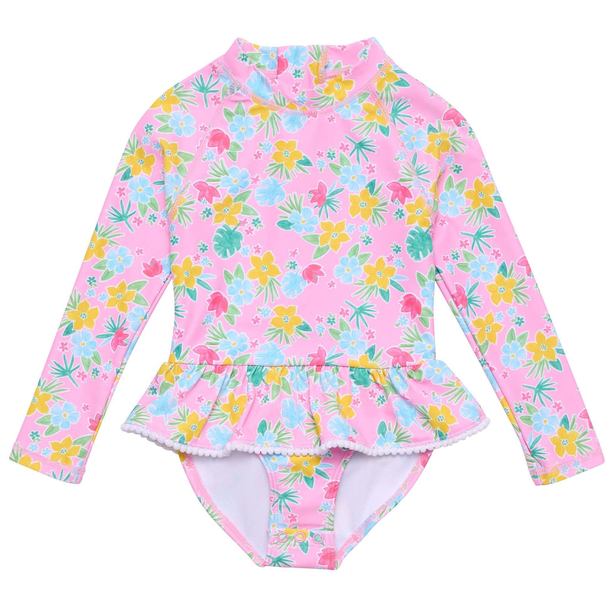A sweet suit for little beach babes, our Buttercup Bloom Skirt Surf Suit captures the gentle beauty of summer in full flower. The delicate floral print brings soft garden romance, while the frill skirt with pom-pom trim adds an extra dose of charm. Made with UPF50+ fabric and a zip back for easy changes, it also includes diaper snaps on sizes up to 24m. The perfect blend of sun safety and sweetness.
