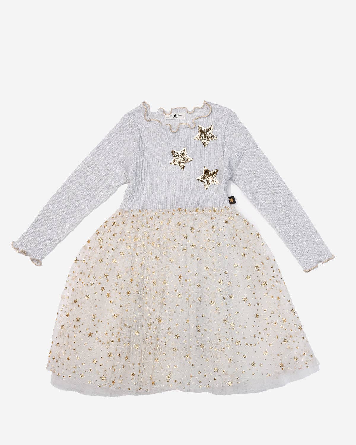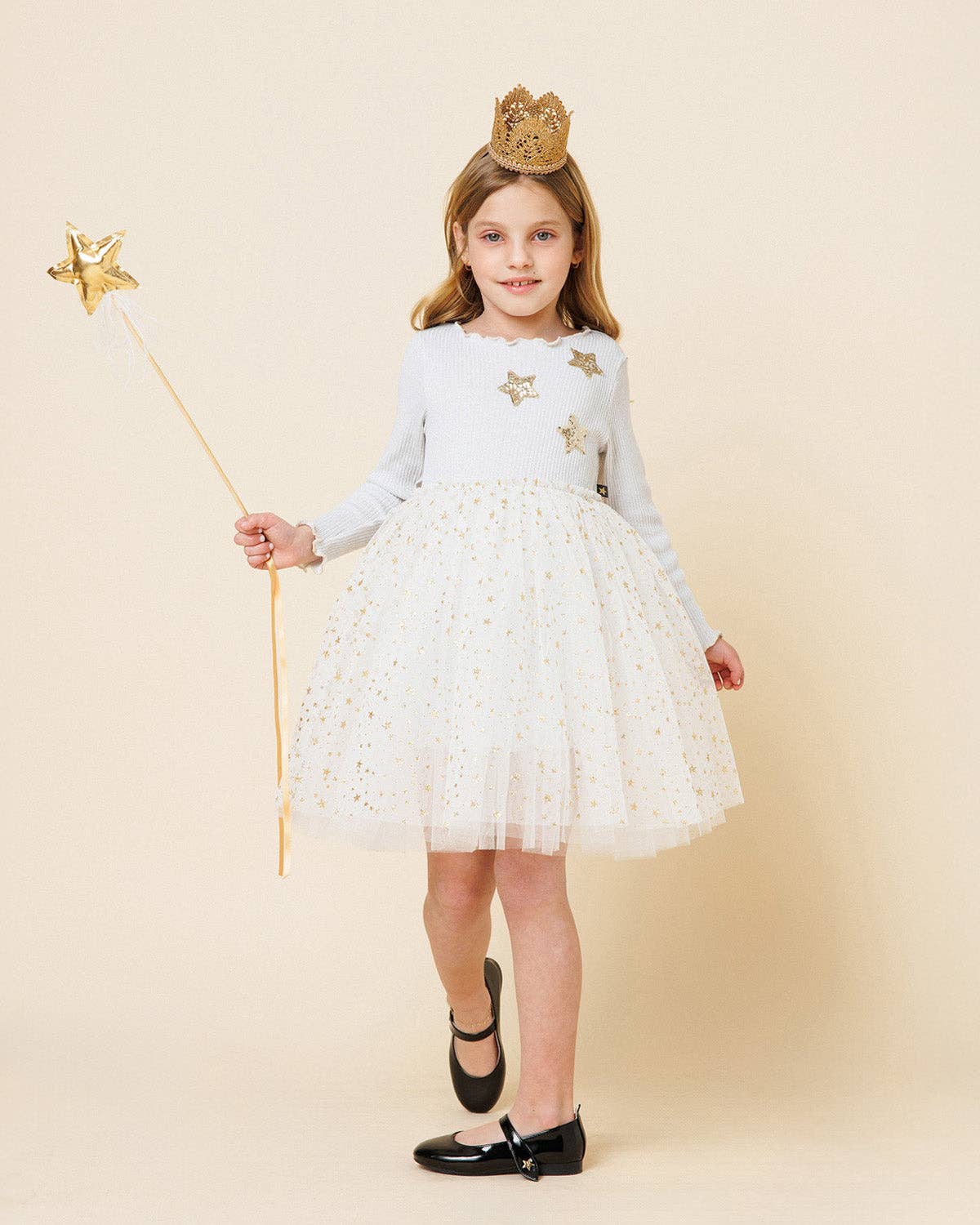 Bold, sparkly, and made to shine. This statement-making dress features a sleek bodice adorned with three glittering gold stars, paired with a layered tulle skirt dusted in shimmering gold accents. Whether she's heading to a birthday bash or twirling through a playdate, this dress brings all the sparkle and star power she needs.